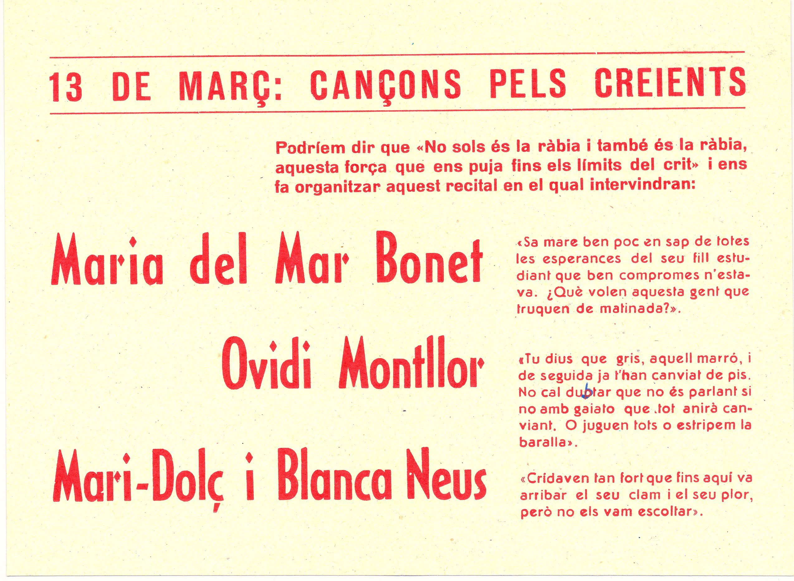 s.d. Cançons pels creients. Maria del Mar Bonet; O. M; Mari, Dolç i Blanca Neus. Tarragona.