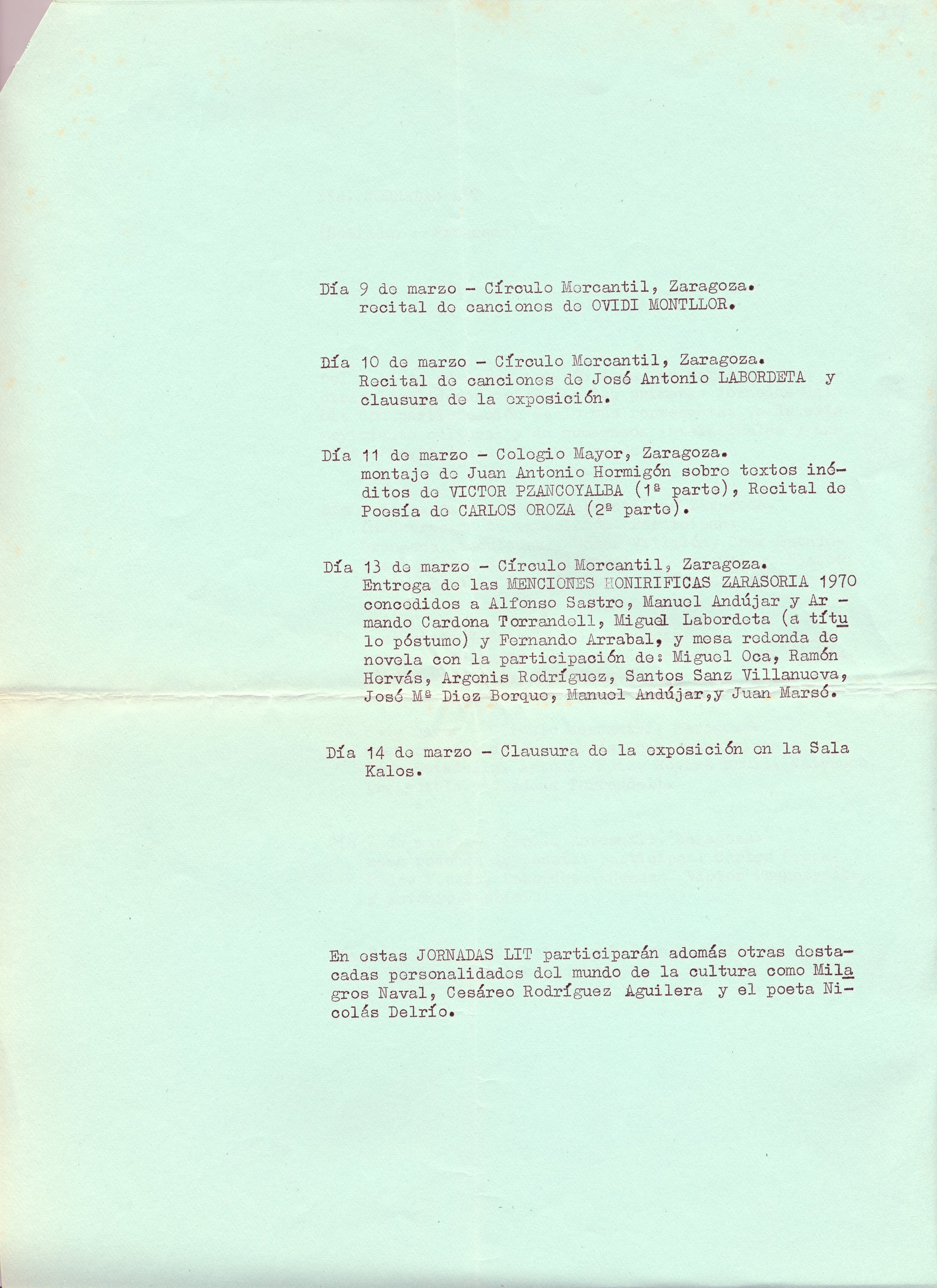 s.d. Primeras Jornadas Lit. (Borrador de Programa). O. M; J. Antonio Labordeta. Zaragoza.