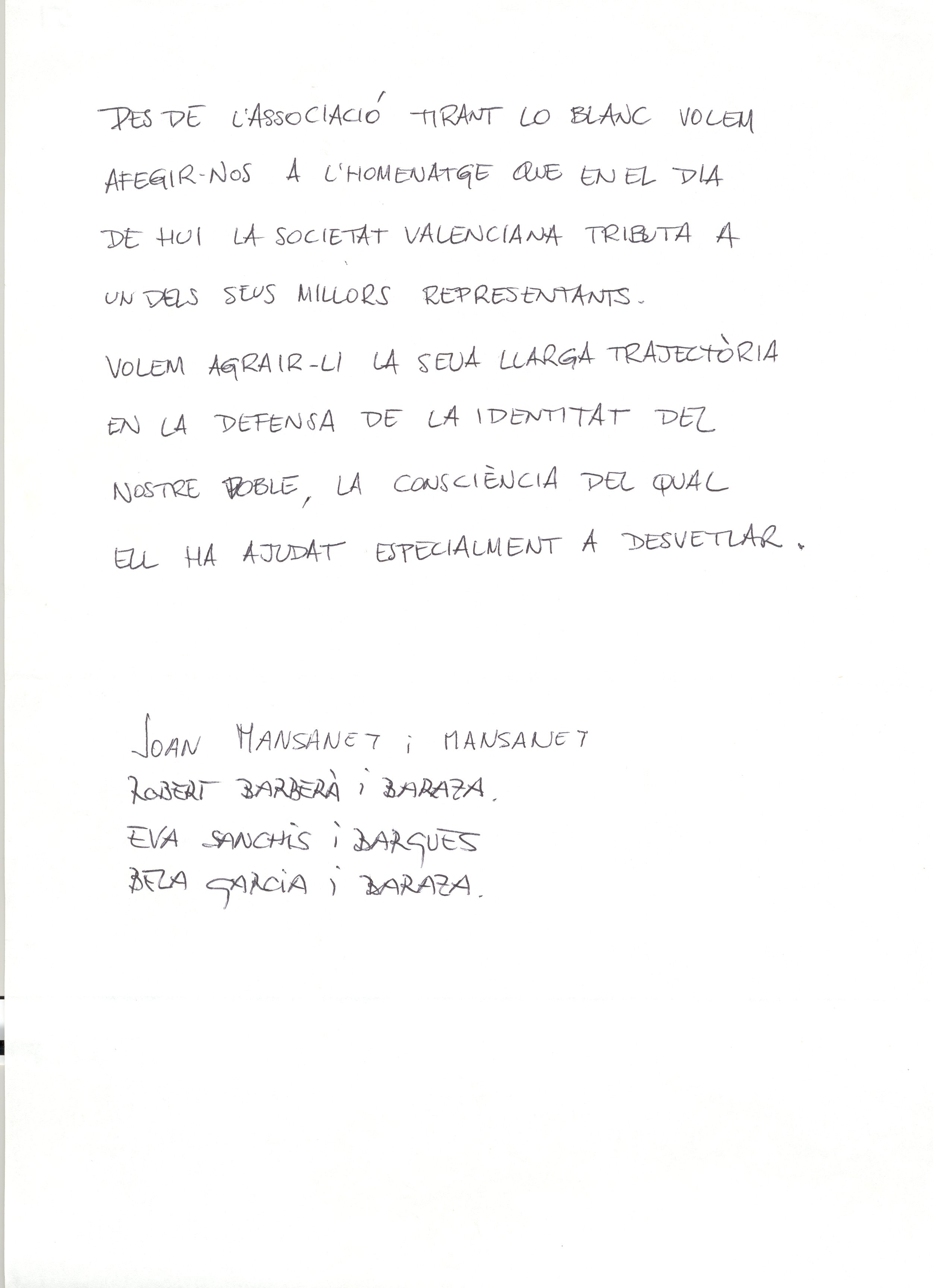 s.d. Carta manuscrita. 1 full. Adhesió a l’homenatge a Ovidi per part de l’Associació Tirant lo Blanc. Signat per Mansanet, Joan; Barberà, Robert; Sanchis, Eva; Garcia, Bela.