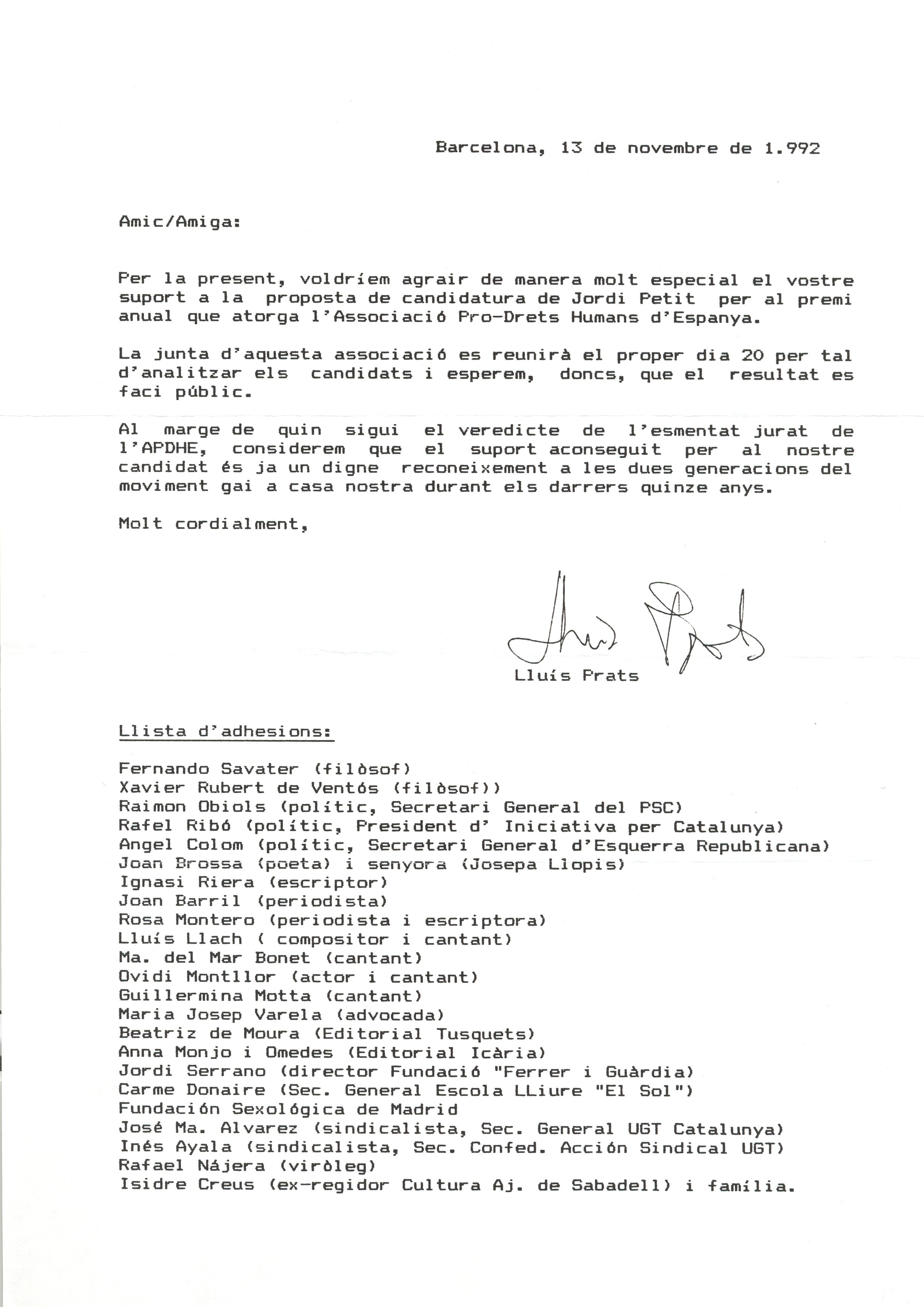 1992, novembre, 13. Barcelona. Carta mecanoscrita. 1 full. Carta de Lluís Prats, agraïnt el suport per la candidatura de Jordi Petit al premi de l’Associació Pro-Drets Humans d’Espanya. Llistat d’adhesions, entre altres, O. M.