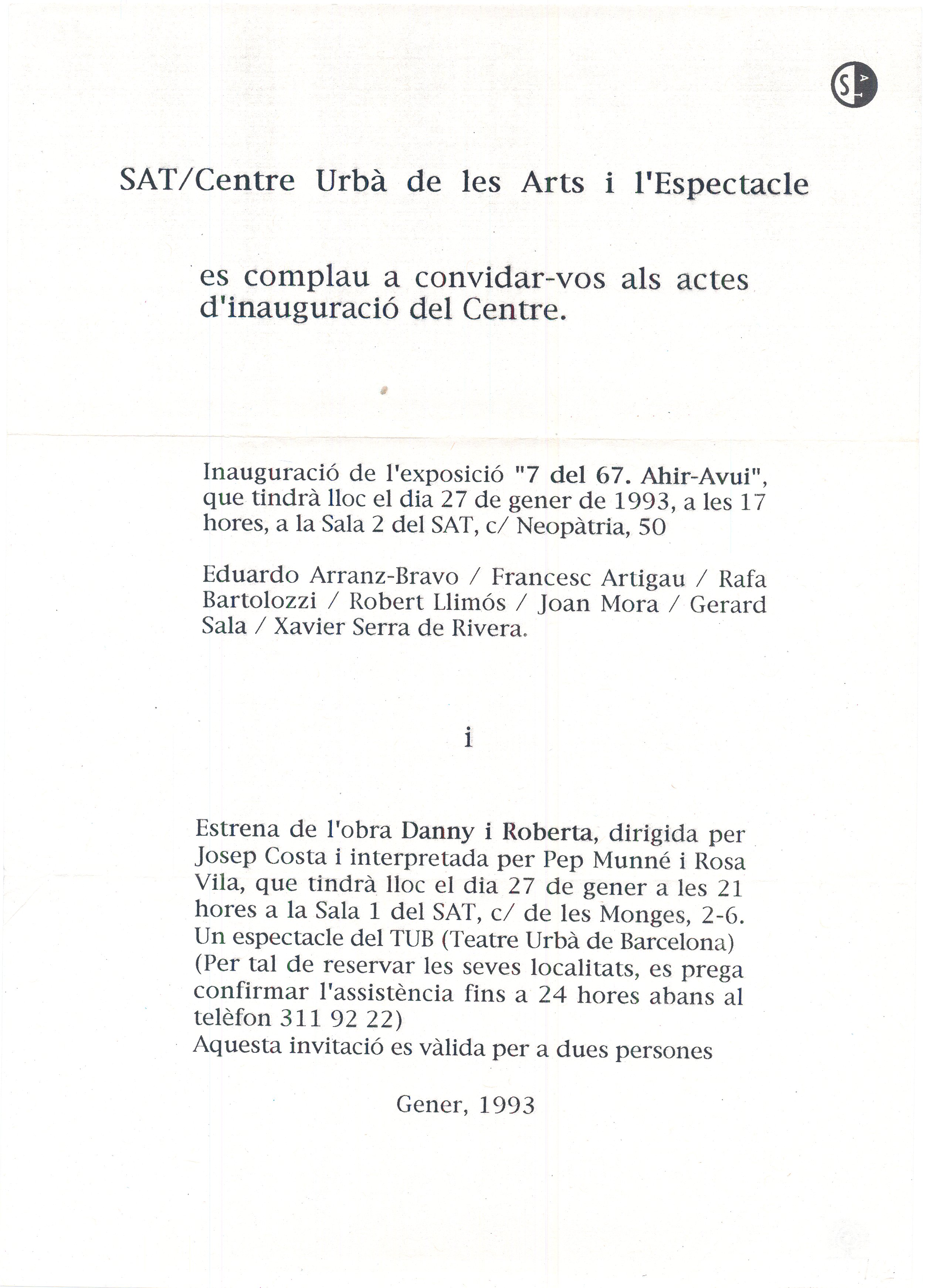 1993, gener. Carta mecanoscrita. 1 full. Invitació del SAT, Centre Urbà de les Arts i l’Espectacle, a l’inauguració del centre i els actes.