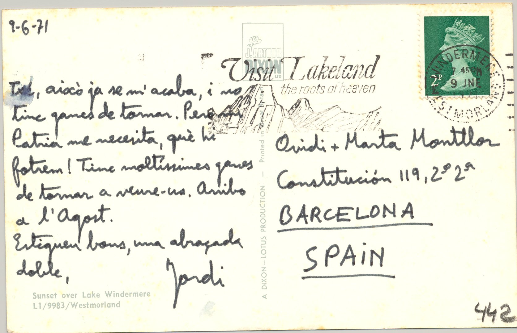 1971, juny, 9. Postal manuscrita. De Jordi dirigida a O. M. i Marta.