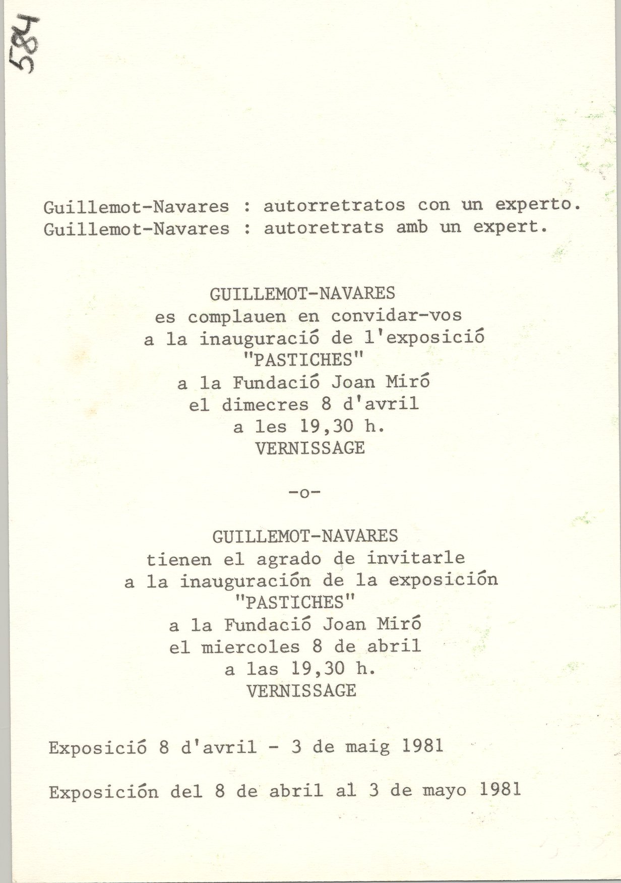 1981, abril, 8. Postal mecanoscrita. La Fundació Joan Miró, invita a l’exposició de Guillamot Navares.