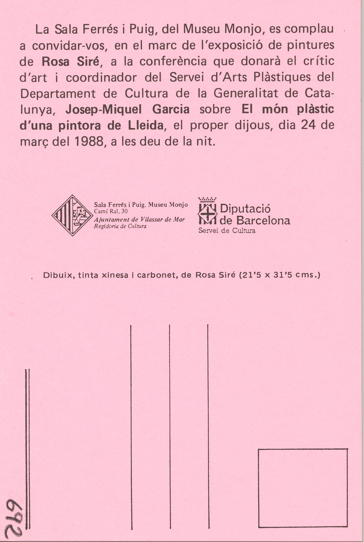 1988, març, 24. Postal mecanoscrita. Invitació de La Sala Ferrés i Puig del Museu Monjo a la conferència de Josep, Miquel Garcia: El món plàstic d’una pintora de Lleida.