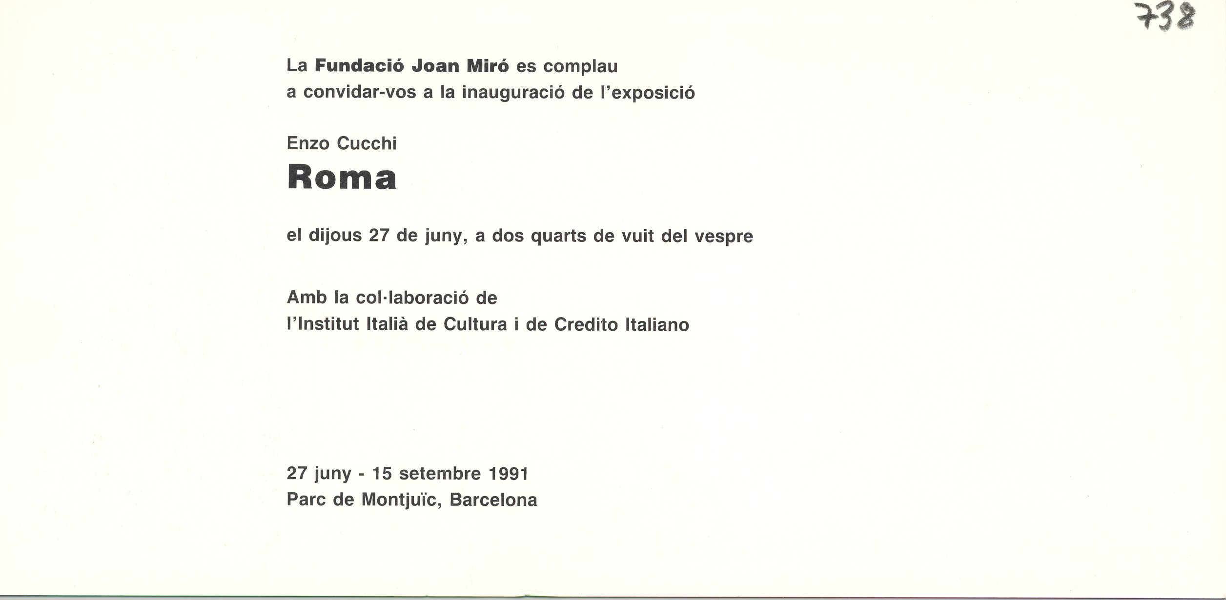 1991, juny, 27. Postal mecanoscrita. Invitació de la Fundació Joan Miró a l’exposició d’Enzo Cucchi: Roma.