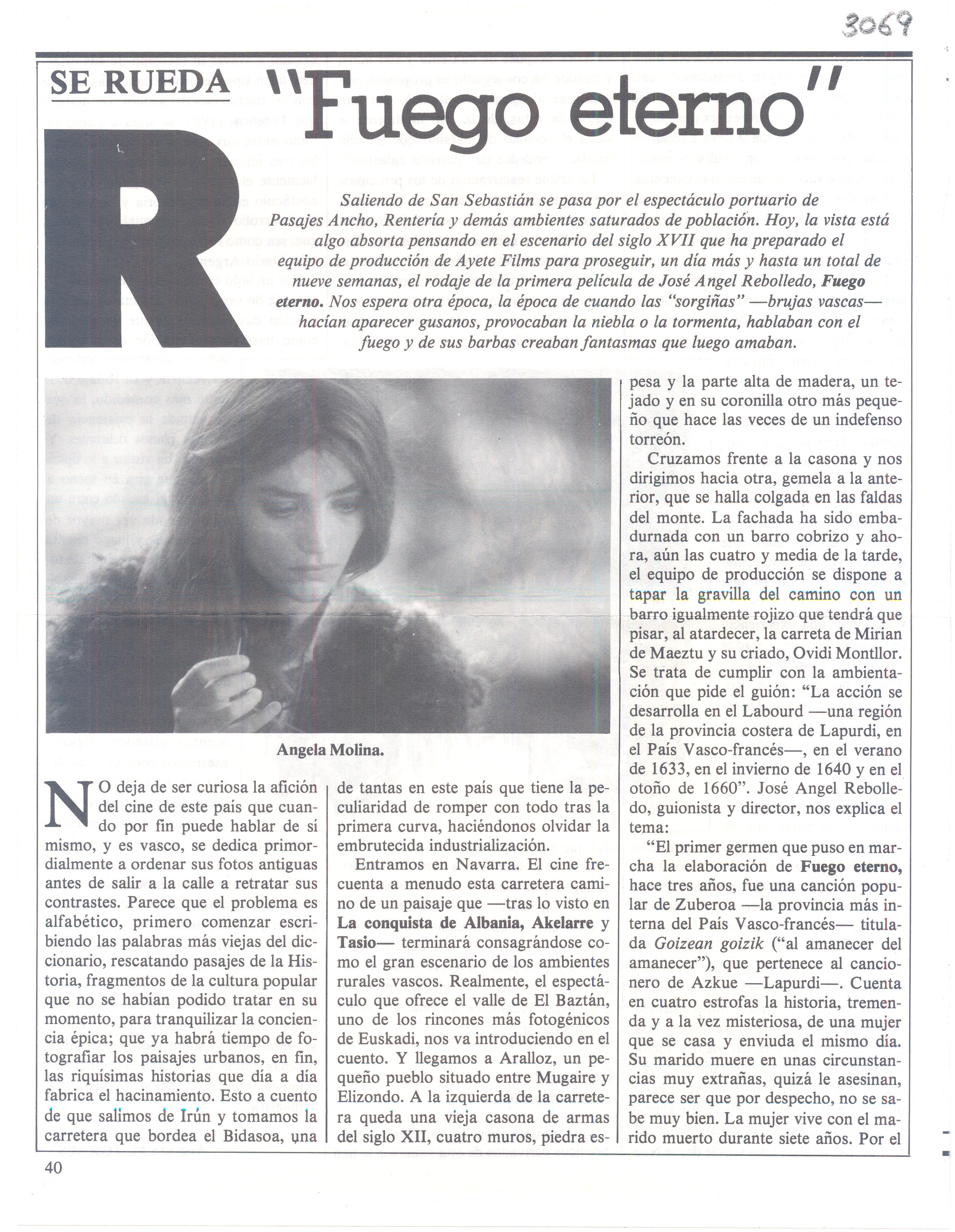 s.d. “Se rueda. Fuego eterno”. Julio Medem Lafont. Reportatge que s’ilustra amb varies fotos del film.