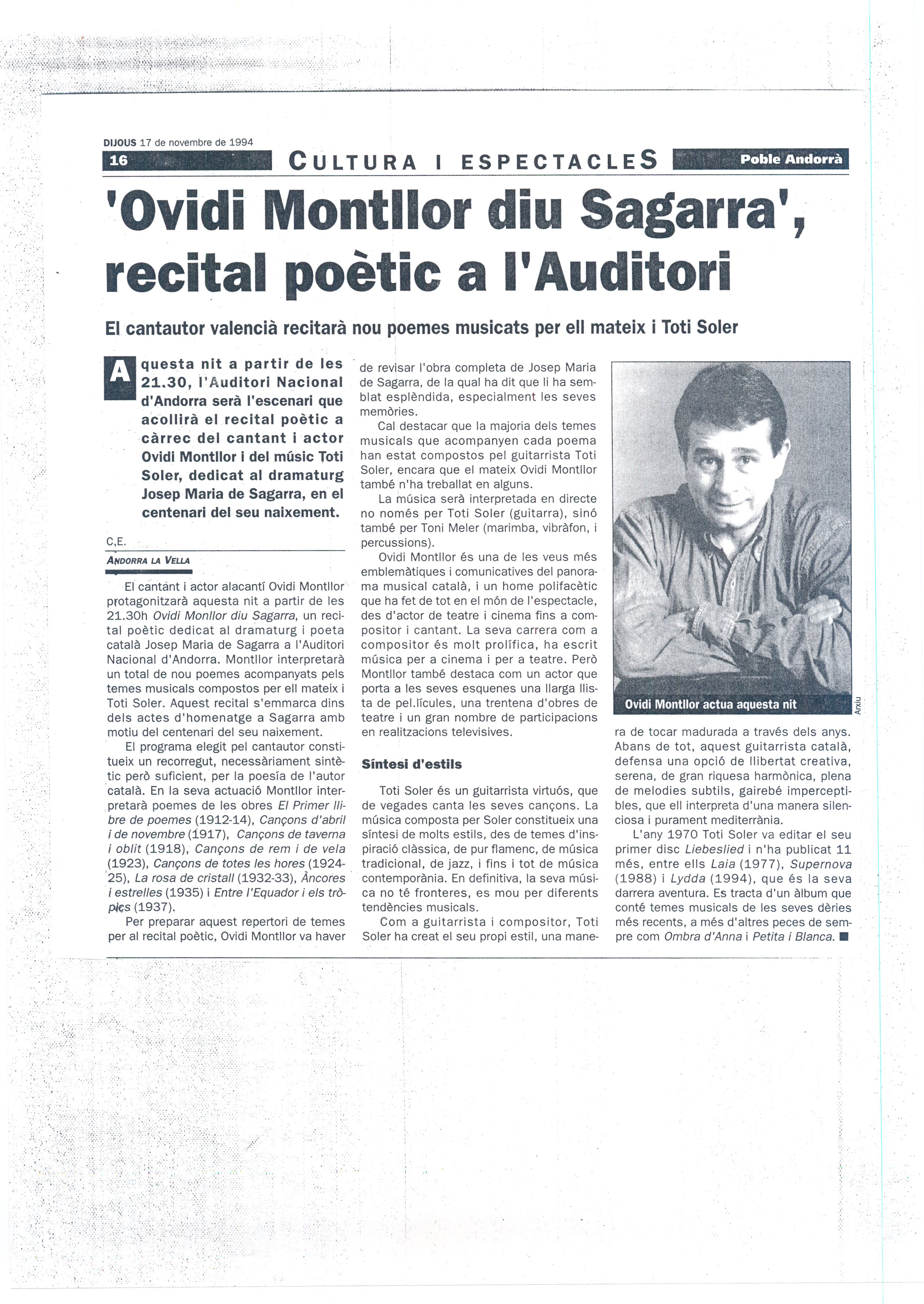 199 novembre, 9. Poble Andorra, Diari d’Andorra. Recull de 18 notícies als diaris sobre un concert d’O. M. i Toti Soler O. M. diu Sagarra.