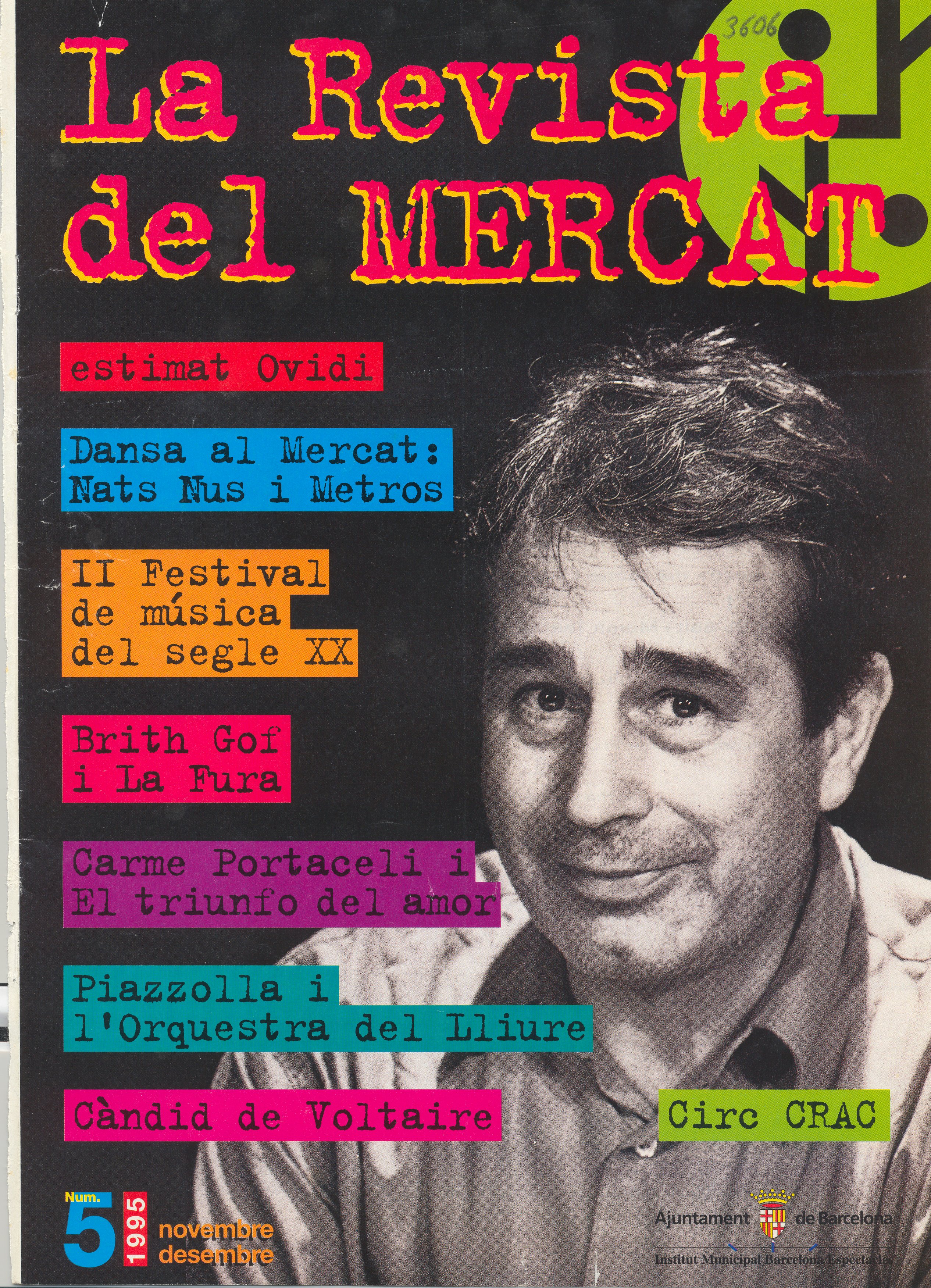 1995, novembre. La Revista del Mercat. “Estimat Ovidi”. Joan M.ª Gual. “Editorial que s’ilustra amb 1 foto de la Sala O. M. al Mercat de les flors. A més inclou “Me acuerdo de Ovidi Montllor” 2 exemplars.
