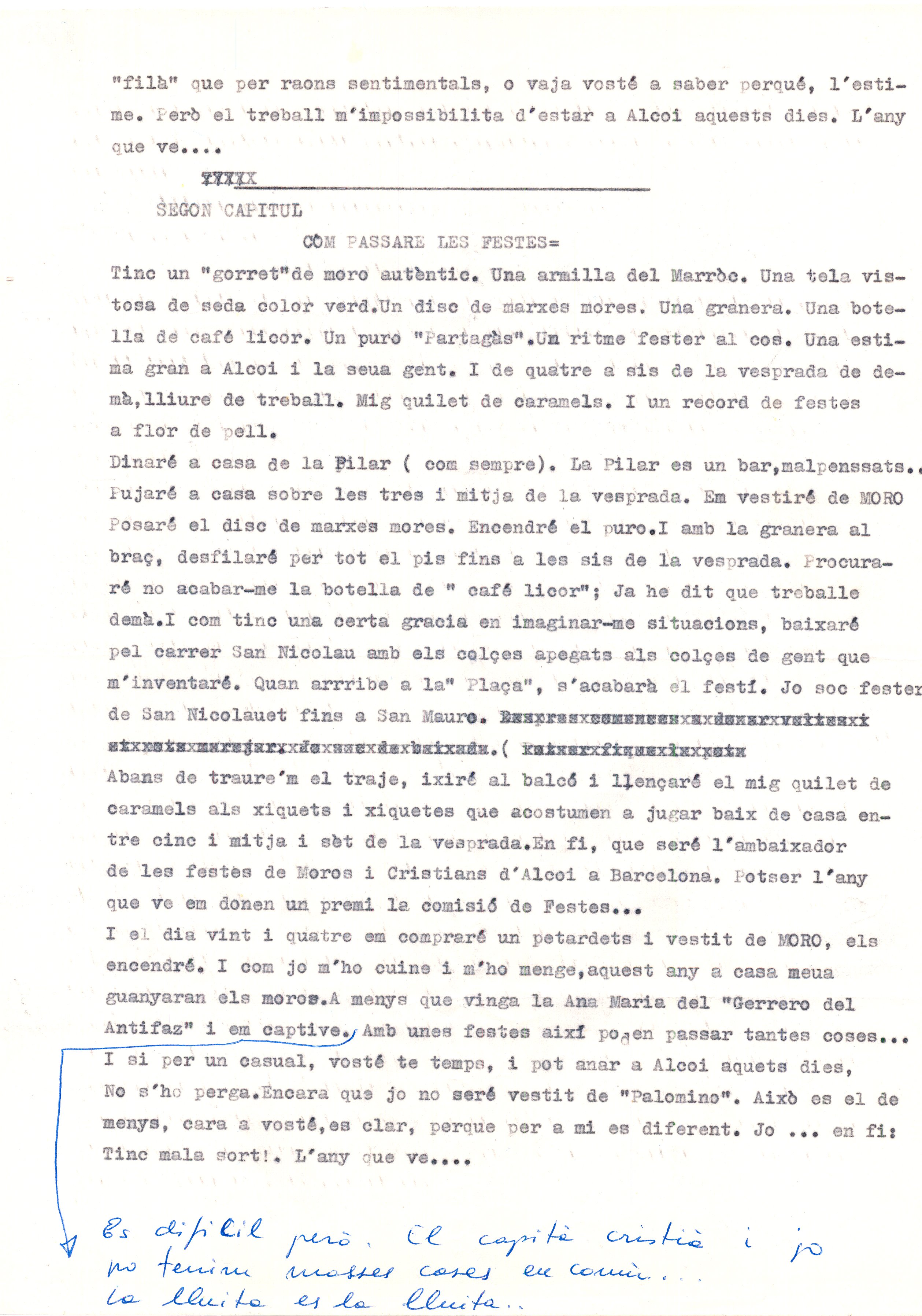 s.d. Moros i Cristians. Capítul primer. Mecanoscrit. 2 fulls. Carpeta. Article sobre les festes de Moros i Cristians d’Alcoi. Anotacions manuscrites.
