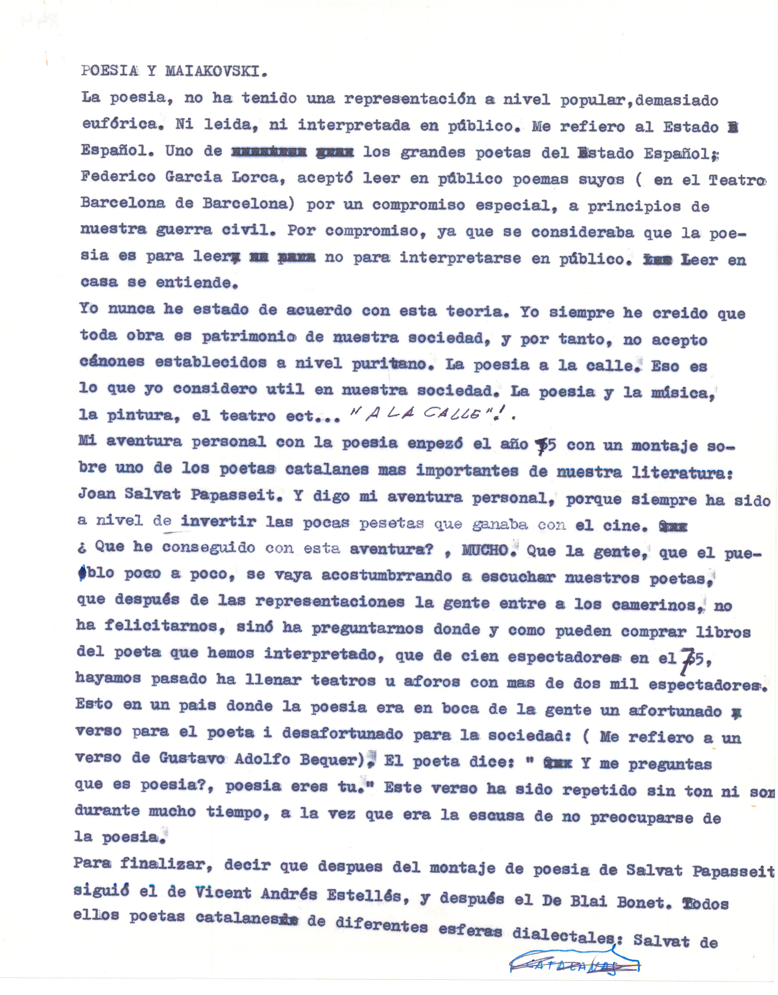 s.d. Poesia y Maiakovski. Mecanoscrit. 2 fulls. Carpeta. Article sobre poesia, Maiakovski i la Guerra, entrada a la OTAN. Anotacions manuscrites.