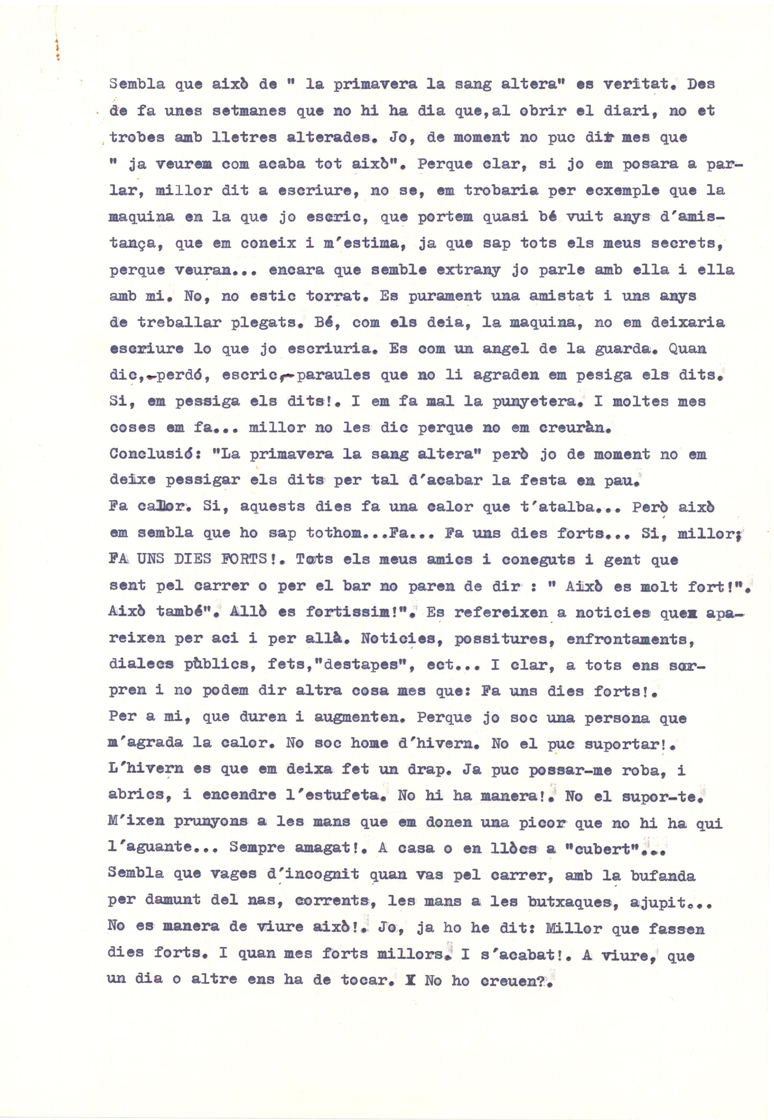 s.d. Mecanoscrit. 2 fulls. Carpeta. Article sobre el temps primaveral i les coses fortes que passen. 1 còpia.