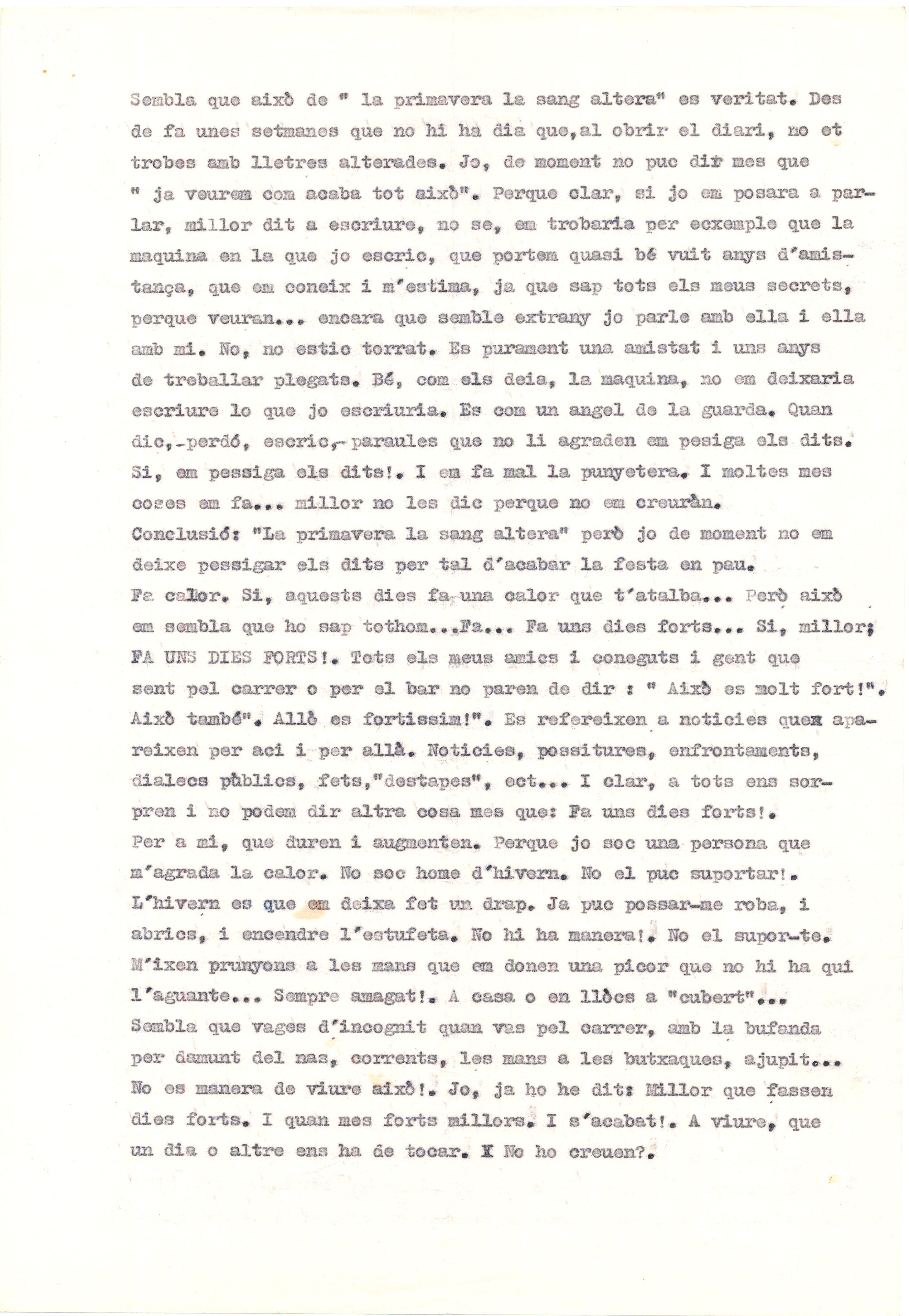s.d. Mecanoscrit. 2 fulls. Carpeta. Article sobre el temps primaveral i les coses fortes que passen. 1 còpia.
