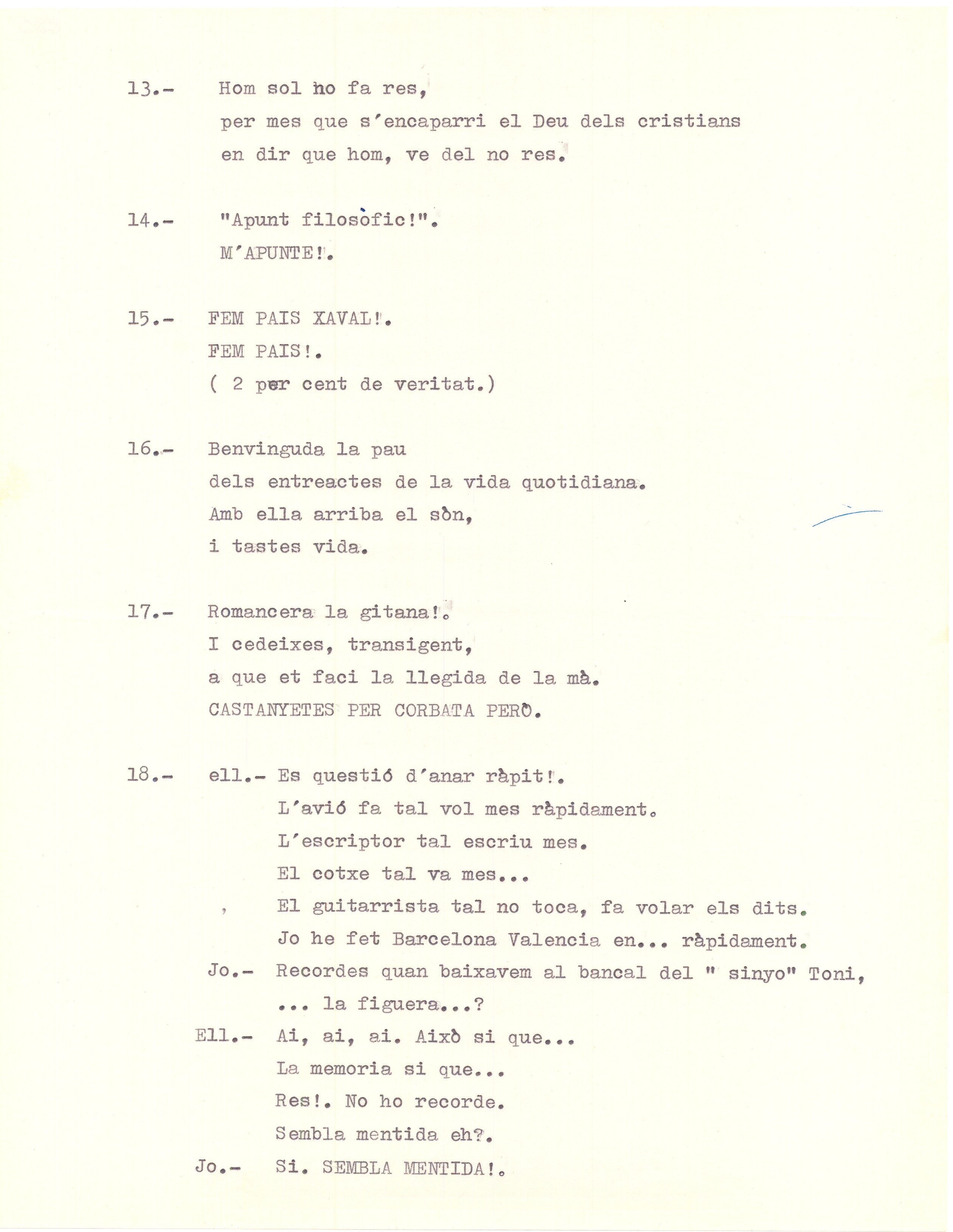 Mecanoscrit. 37 fulls. Carpeta. Recull de poemes, entre els quals s’hi troben: Ja s’ensuma; Al final d’una experiencia; Desesperacions; Des dels 40, están; Plau, me dir que etc... Alguns fragments han sigut publicats al llibre de Núria Cadenas.