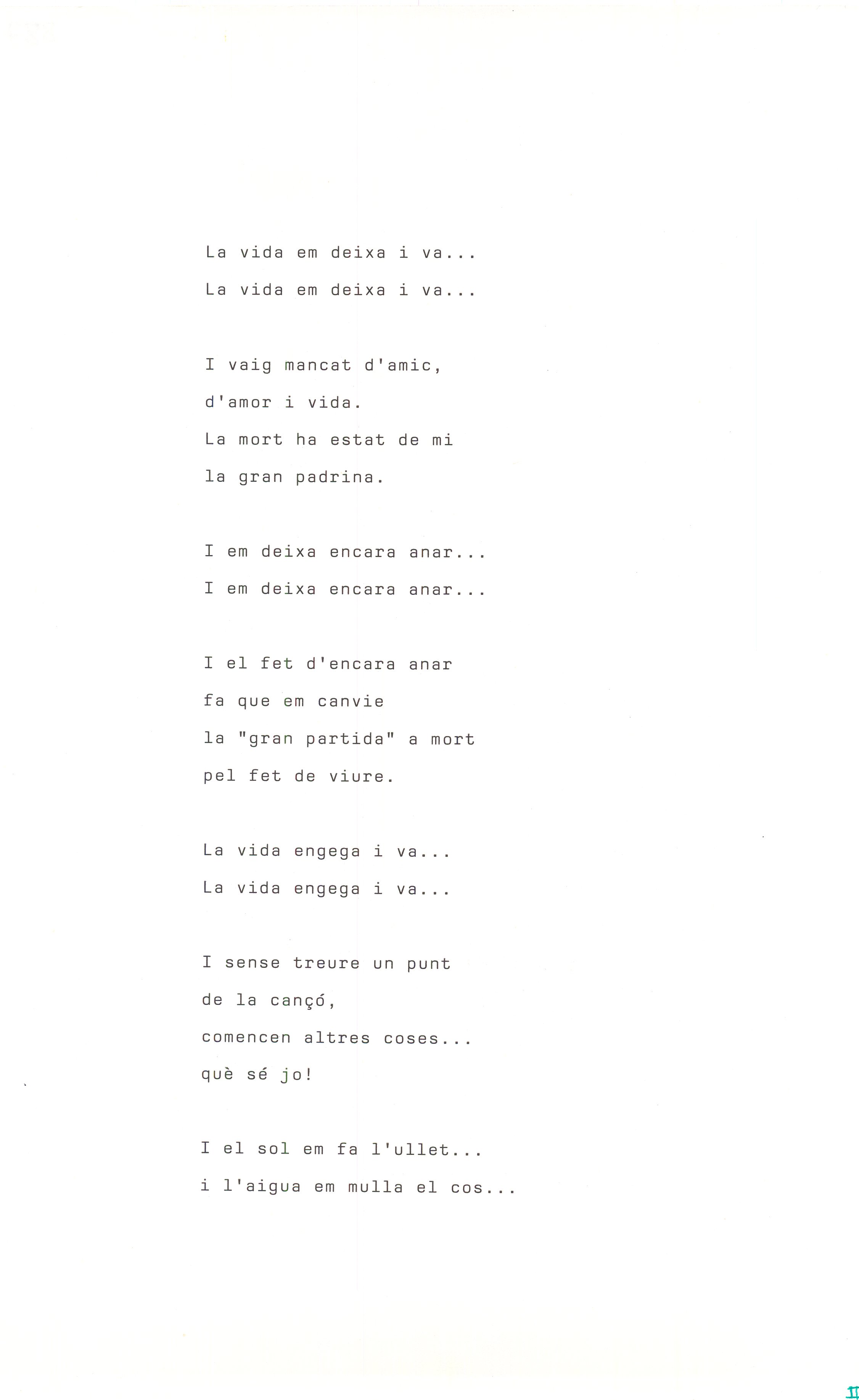 Mecanoscrit. 70 fulls. Carpeta. Recull de poemes, alguns amb anotacions manuscrites, alguns amb anotacions musicals. Alguna cosa hi ha en el vent; És inútil; Que més voleu?; No té nom; El pas del temps porta el renec; A Garcia Lorca etc...
