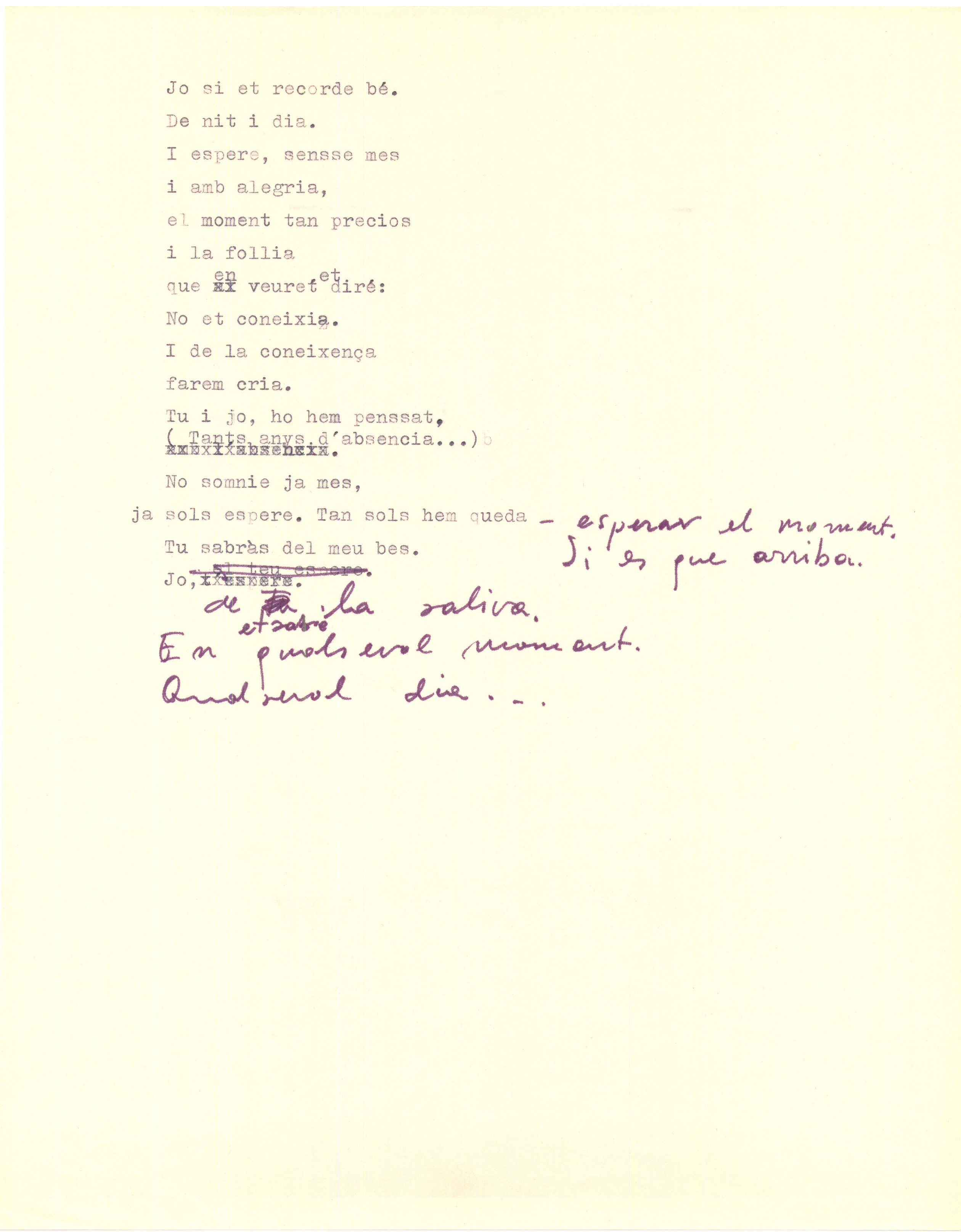 Mecanoscrit. 70 fulls. Carpeta. Recull de poemes, alguns amb anotacions manuscrites, alguns amb anotacions musicals. Alguna cosa hi ha en el vent; És inútil; Que més voleu?; No té nom; El pas del temps porta el renec; A Garcia Lorca etc...