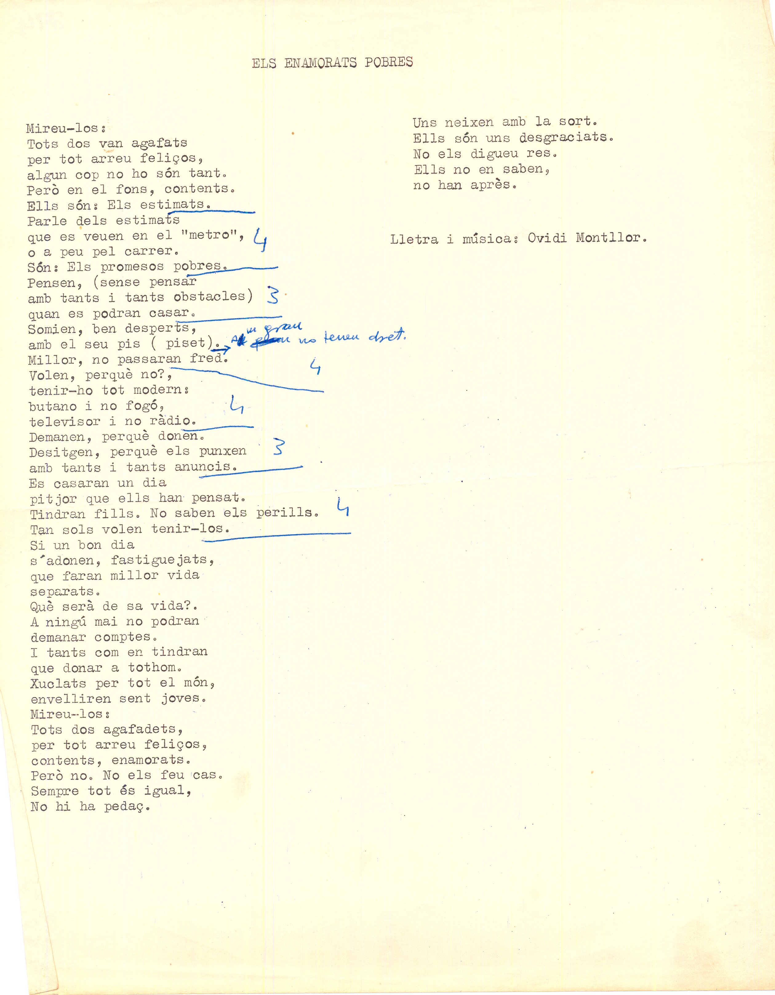 Cançons de tots els temps. Mecanoscrit. 10 fulls. Carpeta. Recull de poemes. A ma filla; Temps d’esforç; Fundacions de la rabia; Parlem d’amor; A ella, content d’haver, la estimat; Ajuda a pujar al tren etc... Alguns amb anotacions manuscrites, i alguns amb anotacions musicals.
