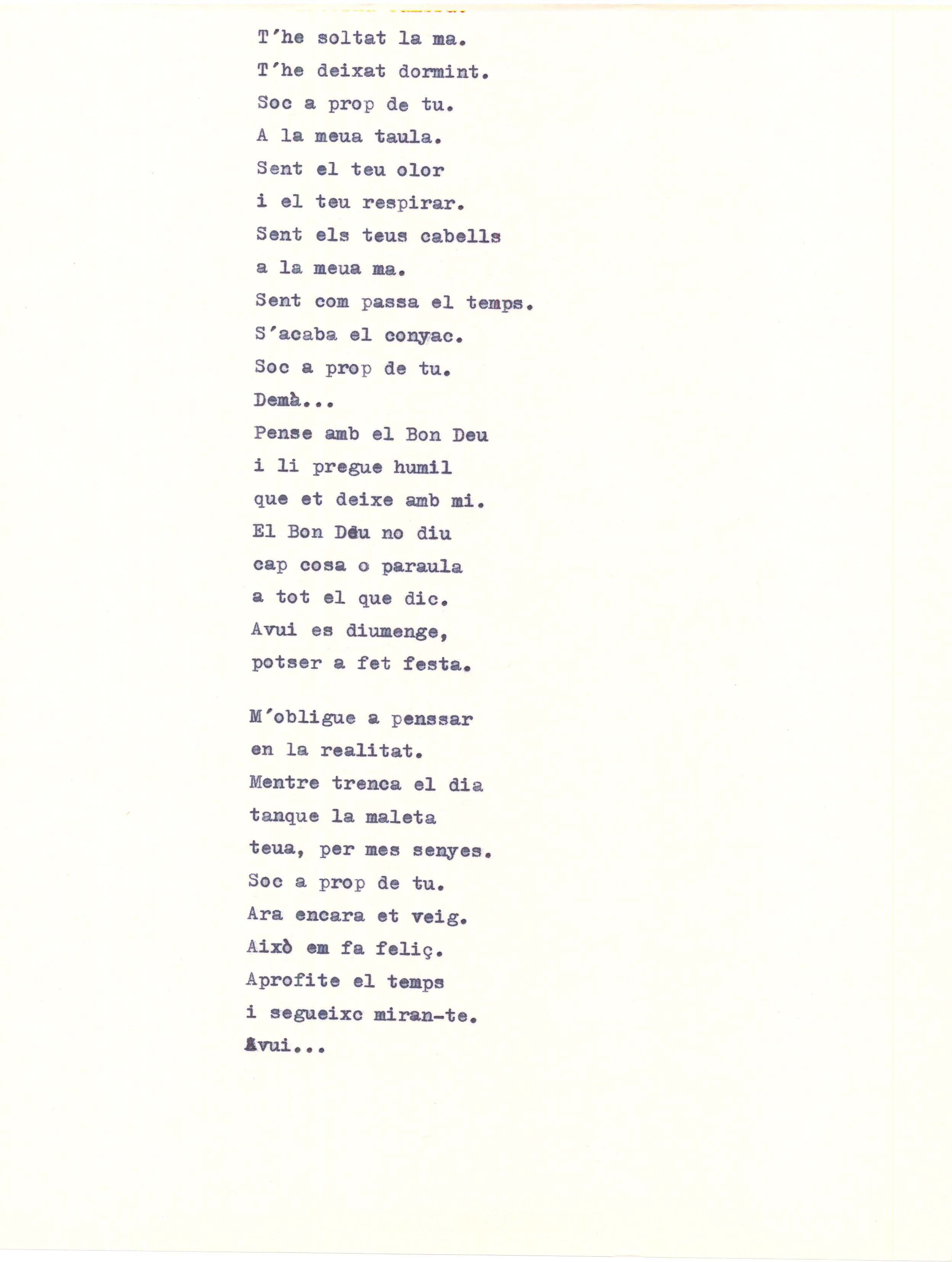 1974, febrer. Barcelona. Millor boig que viu! Mecanoscrit. 52 fulls. Carpeta. Recull de poesies dedicat a la seua filla Helena. Inclou entre altres, A manera d’introducció; Menalda; Estima de cor; Estima de cap; Martiri; No és tot el viure junts. Etc... Algunes apareixen al llibre de Núria Cadenas.