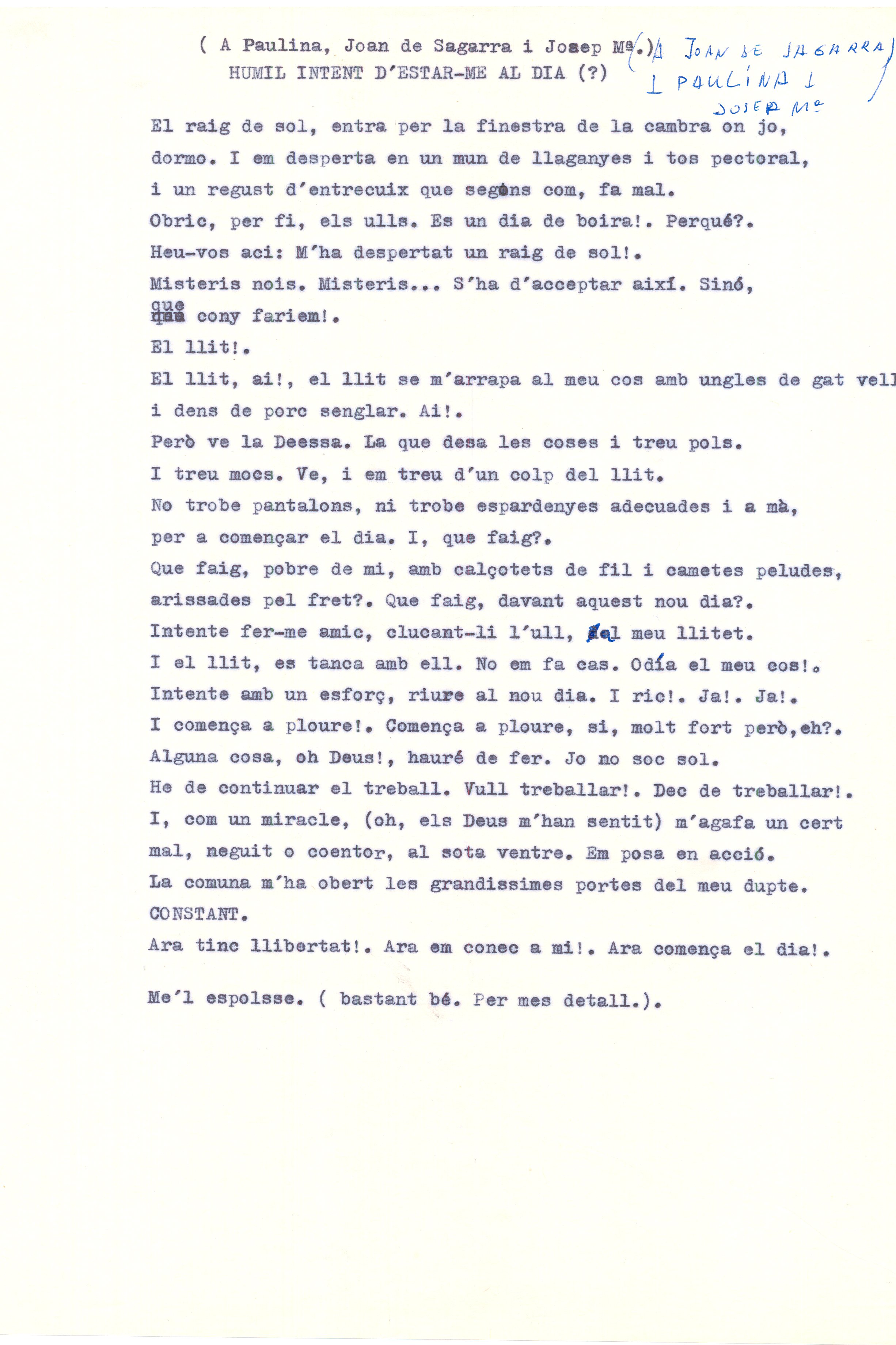 1974, febrer. Barcelona. Millor boig que viu! Mecanoscrit. 52 fulls. Carpeta. Recull de poesies dedicat a la seua filla Helena. Inclou entre altres, A manera d’introducció; Menalda; Estima de cor; Estima de cap; Martiri; No és tot el viure junts. Etc... Algunes apareixen al llibre de Núria Cadenas.