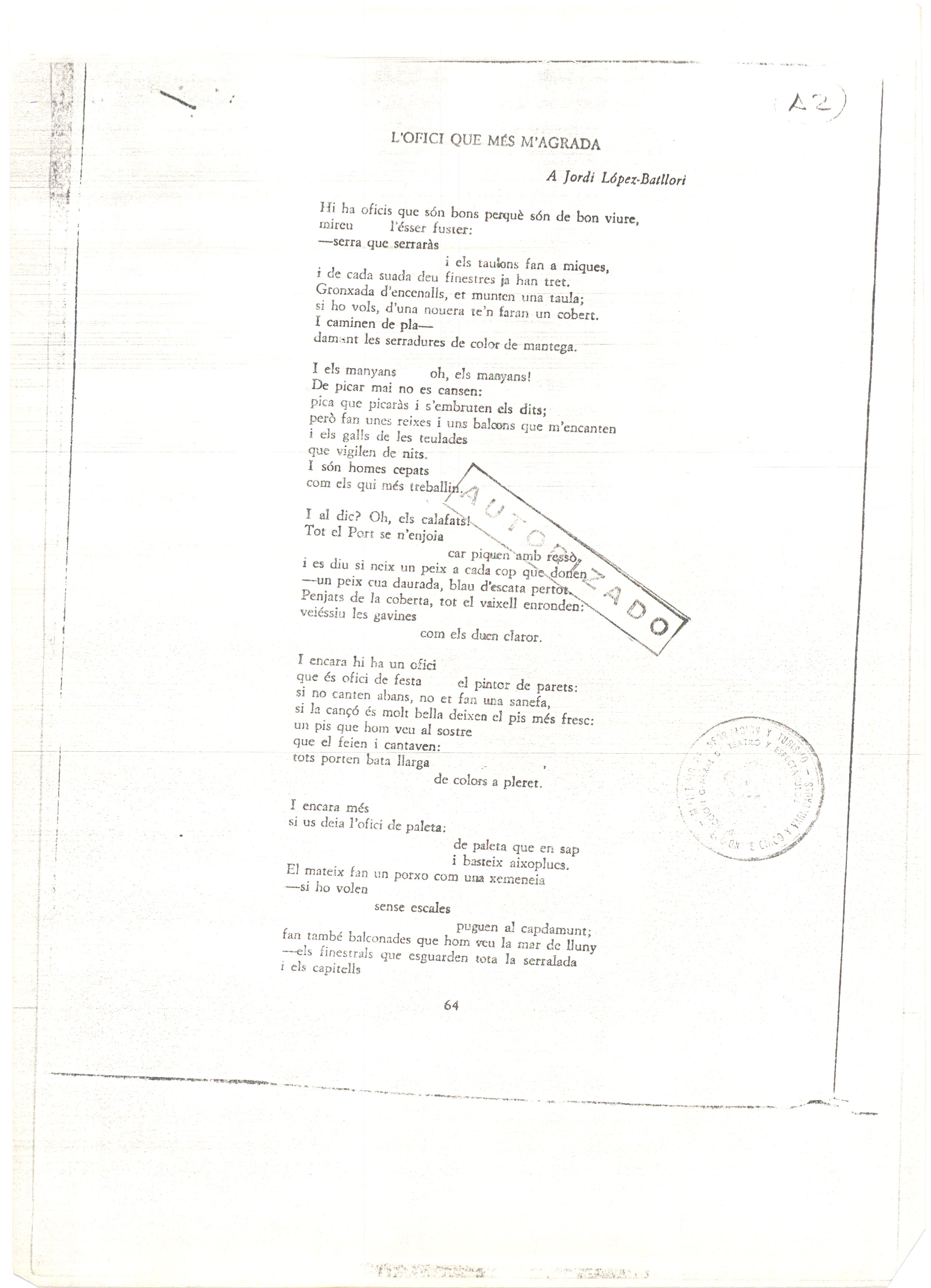 Mecanoscrit. 53 fulls. Carpeta. Recull de cançons presentades a censura i autoritzats. Compulsats. També inclou poemes d’altres autors musicats per O. M. Inclou entre altres: Garrotada en Swing; Ais!; Diccionari de butxaca; Carta a casa; Ell; Als nous amos; Si senyor; L’Escola de Ribera; Les meues vacances; Ploraves...