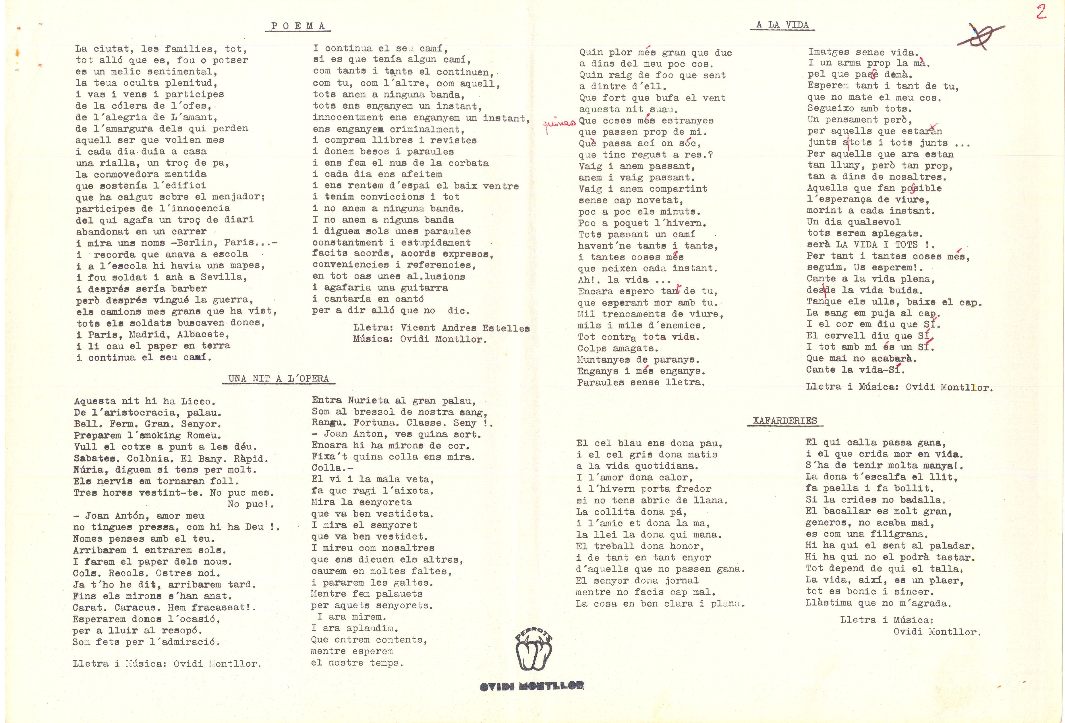 Mecanoscrit. 85 fulls. Carpeta Recull de cançons per a presentar a censura sense aprobar, ni compulsats. Alguns tenen anotacions manuscrites i algunes anotacions musicals. També inclou poemes d’altres autors musicats per O. M. Inclou entre altres: Cançó ficció; Homenatge a Teresa; Va com va; Sol d’estiu; Jo sóc amunt; La cançó del cansat; La Samarreta; A la vida; Tot explota pel cap o per la pota etc...