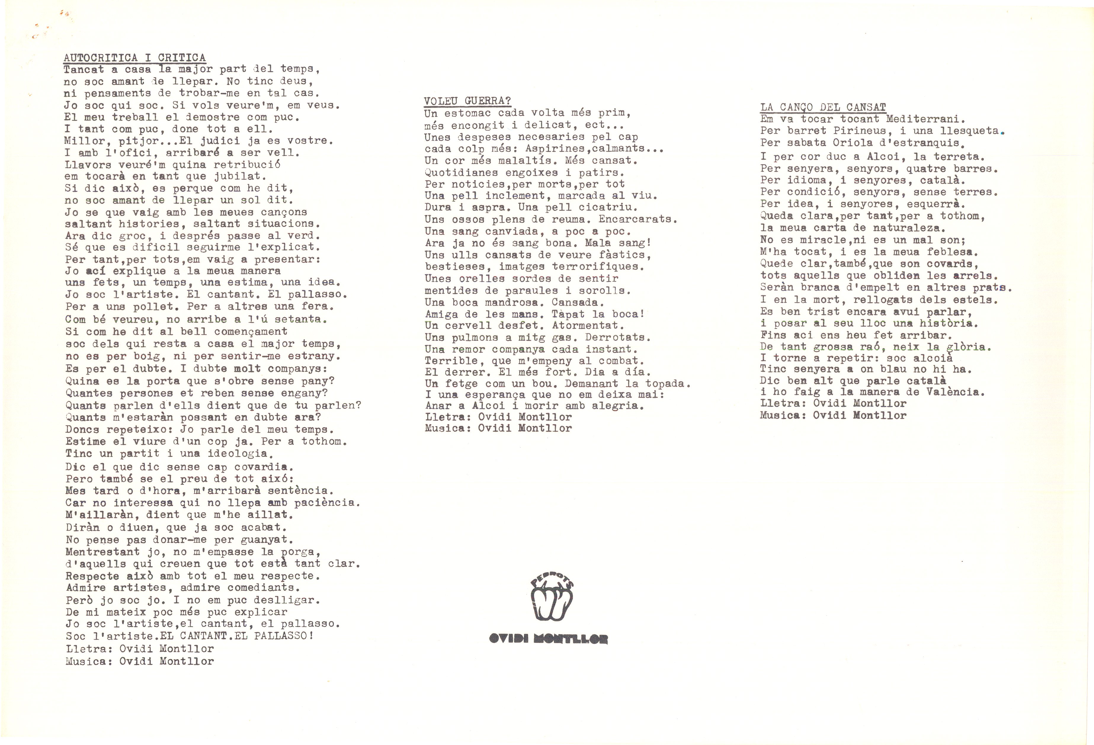 Mecanoscrit. 85 fulls. Carpeta Recull de cançons per a presentar a censura sense aprobar, ni compulsats. Alguns tenen anotacions manuscrites i algunes anotacions musicals. També inclou poemes d’altres autors musicats per O. M. Inclou entre altres: Cançó ficció; Homenatge a Teresa; Va com va; Sol d’estiu; Jo sóc amunt; La cançó del cansat; La Samarreta; A la vida; Tot explota pel cap o per la pota etc...